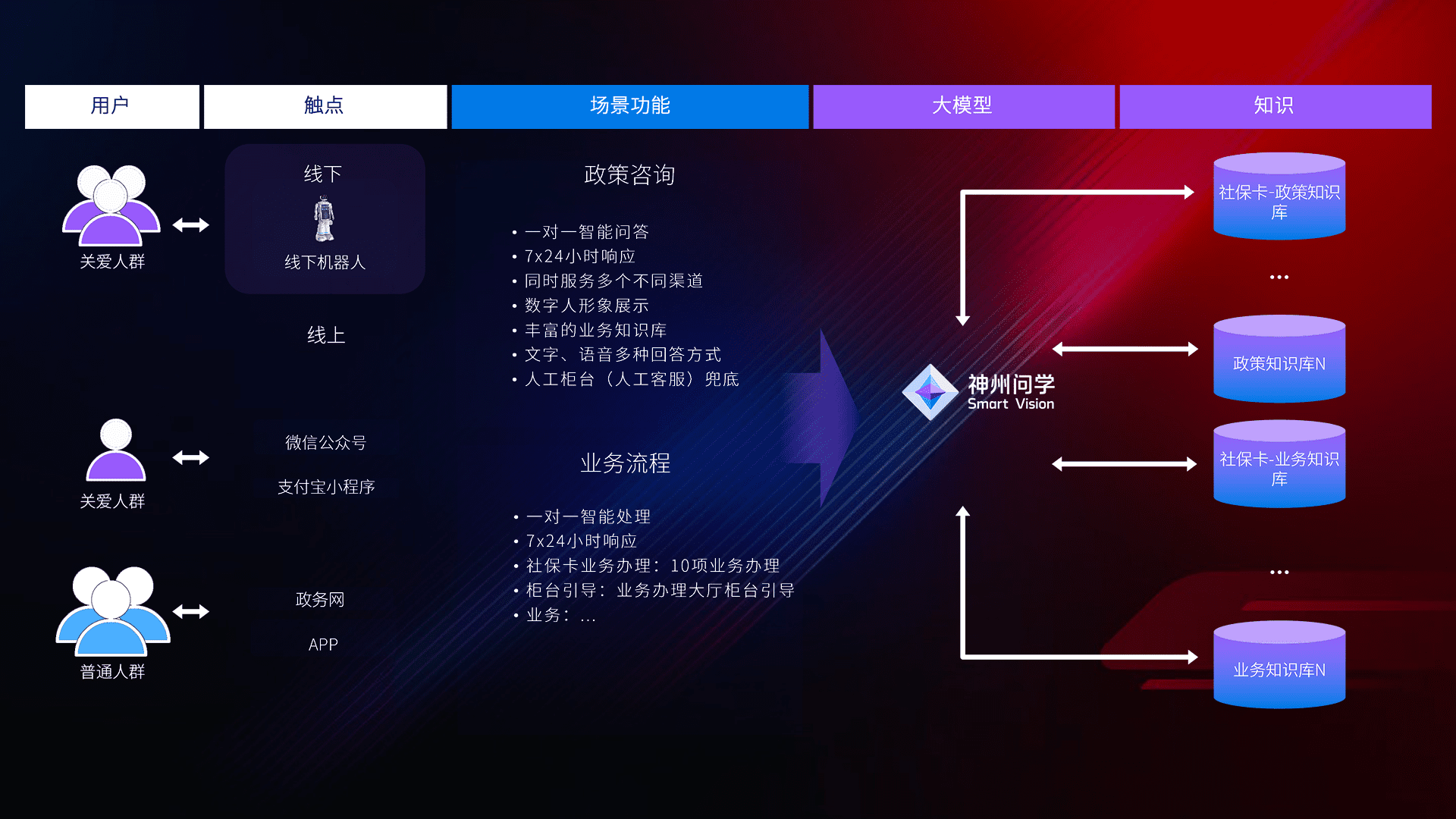 • 线上线下全覆盖:线上提供微信公众号、、、支付宝小程序、、、政务网、、、app多种渠道,,,与线下机器人形成完整服务体系。。。。
